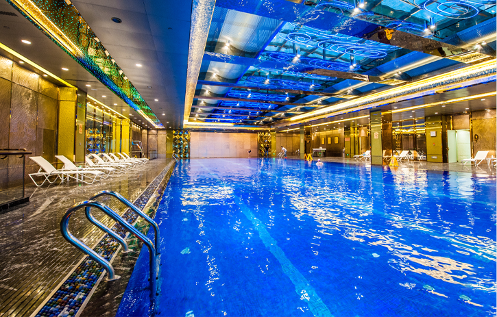 金磚酒店配有具備“國際泳聯”標準的無邊際游泳池,水質來源于1850米深層地下溫泉水,體驗溫泉與游泳的雙重享受